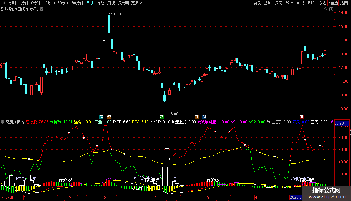 指标将趋势判断(红绿线)、动量分析(MACD)、摆动指标(KDJ)及自定义买点逻辑集成在一个副图窗口中。