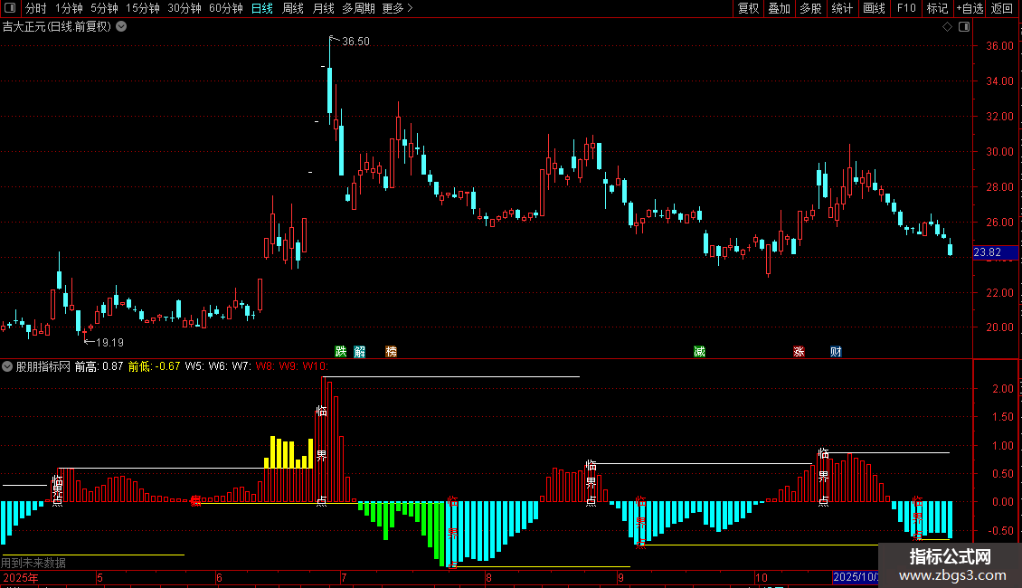 观察MACD柱状线与“前高”、“前低”趋势线的相对位置。当红色柱体突破白色“前高”线时,可能预示上涨动能增强;当青色柱体跌破黄色“前低”线时,可能预示下跌动能加强。同时关注“临”、“界”、“点”的文字提示位置,它们标识了潜在的阻力或支撑临界区域。