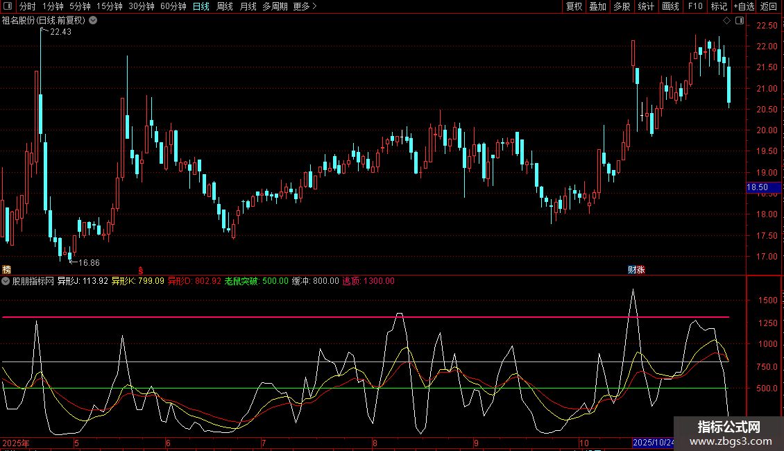 指标结合了筹码分布、KDJ及价格区间,通过异形J、K、D三条线进行动态分析。异形J线为核心波动线,异形K线为短期趋势线,异形D线为长期趋势线。老鼠突破、缓冲、逃顶为三条水平参考线,用于识别关键突破位与风险区域。指标旨在捕捉价格在筹码与动能共同作用下的趋势转折点。