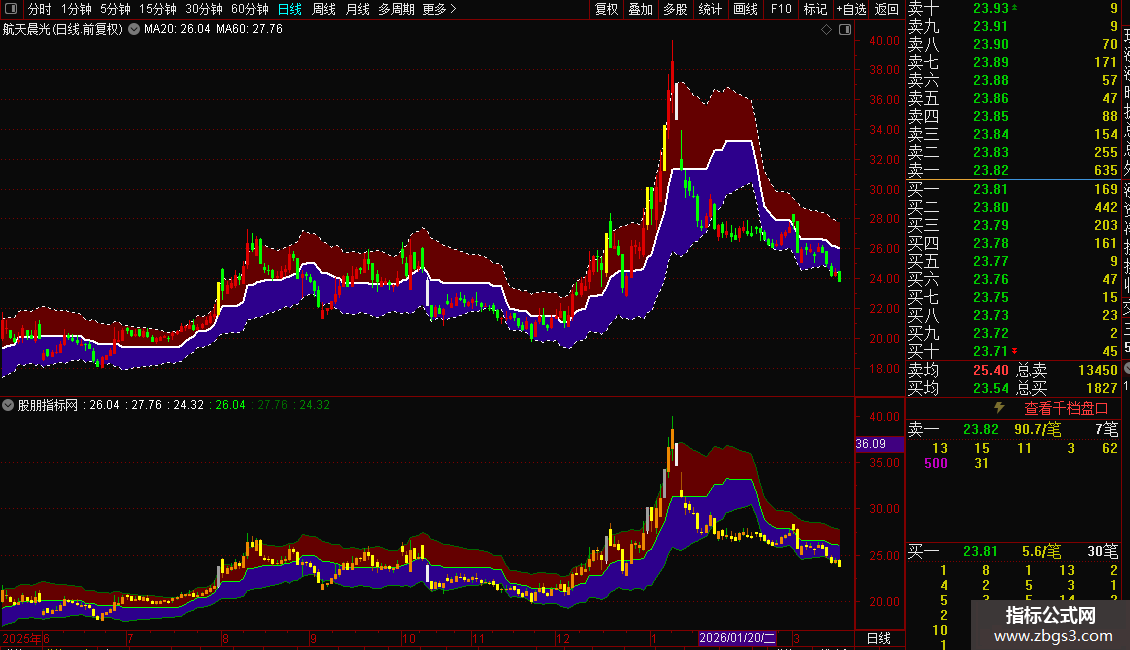 指标直接应用于主图,用于分析价格运行区间、波动率和识别关键价格行为(尤其是涨跌停)。通道中轨可视为动态多空平衡线,上下轨构成波动边界。当价格触及或突破轨道时,可结合其他信号判断趋势强度或反转可能。涨跌停的醒目标识有助于快速定位市场极端情绪点。