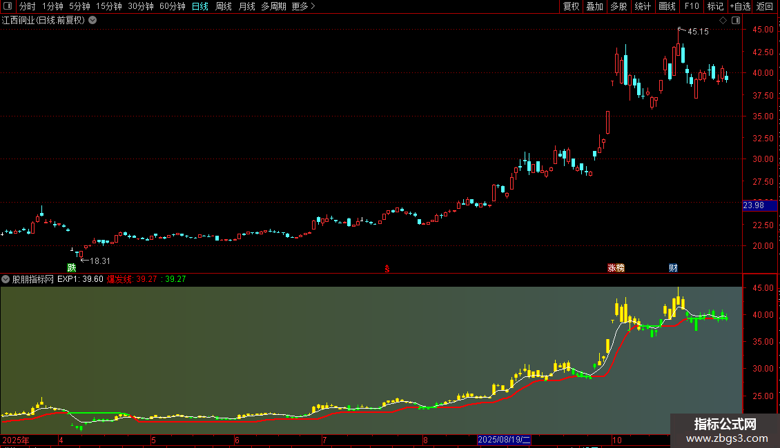 爆发线:基于价格均线计算出的一个压力/支撑参考线。当股价运行在此线之上时,该线显示为红色,可能代表支撑;当股价跌破此线时,该线段显示为绿色,可能代表压力。