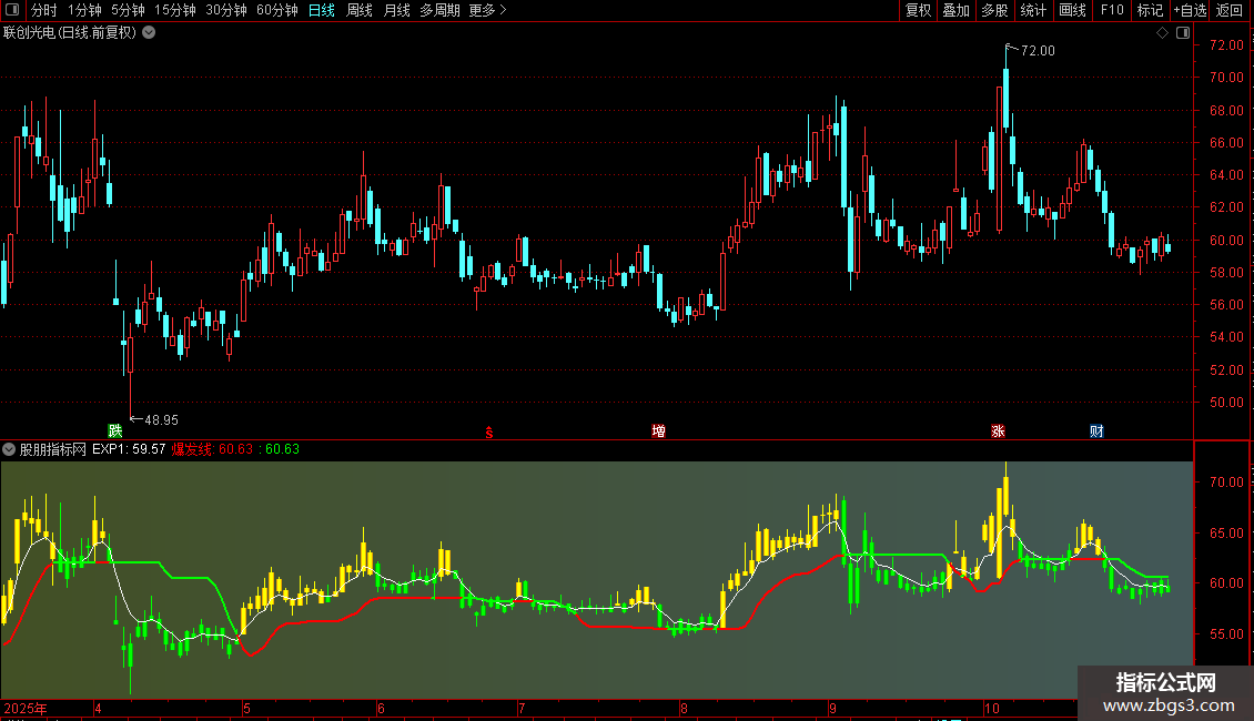 2. “黑将军”信号:这是一个核心的买入预警信号。它综合了多个条件,包括价格在特定周期内的相对位置、动量变化以及超卖状态,旨在捕捉股价经过调整后可能出现的强势启动点。当信号出现时,K线会变为红色系,并标注“黑将军”文字。