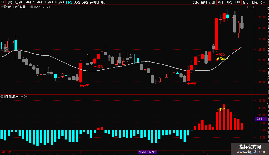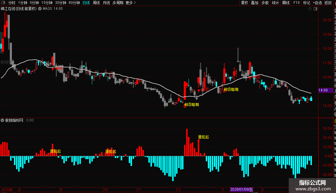 1. 主图公式:加载后,K线将根据“鱼哥值”与量能变化显示颜色。红色宽柱表示放量阳线且主力能量为正,青色柱表示缩量阴洗盘。出现“鲸吞”图标与“章鱼哥”标记时,预示主力可能发起攻势。
