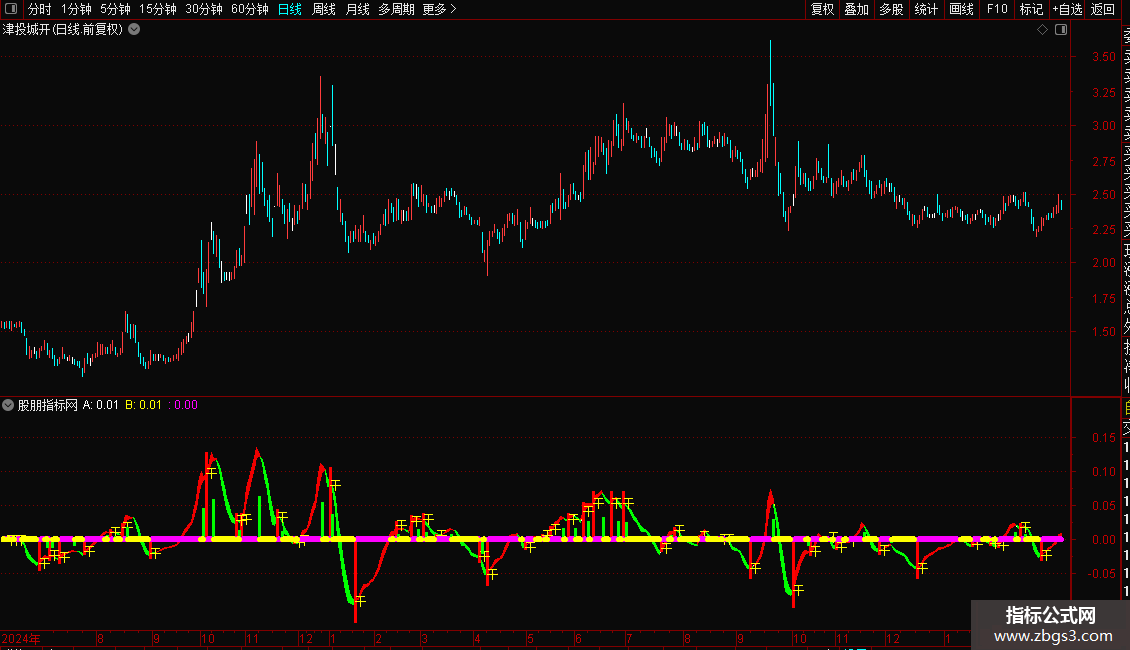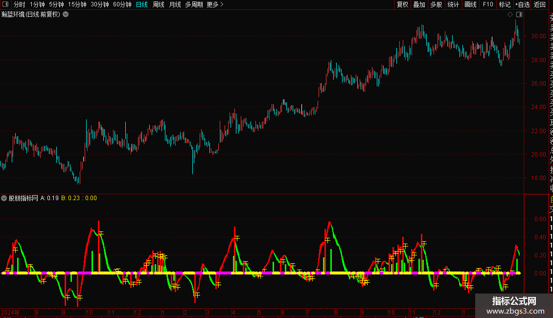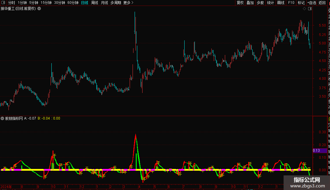 指标通过两条不同周期的指数均线差值构建动能带,直观展示多空力量变化。红色区域代表多头强势,绿色区域代表空头主导。操作策略上,当动能线由弱转强并出现“干”字信号时,视为买入时机;反之,当动能线由强转弱时,则为卖出或减仓信号。粗线条颜色变化辅助判断趋势延续性,紫色代表上涨加速,青色代表下跌加速。