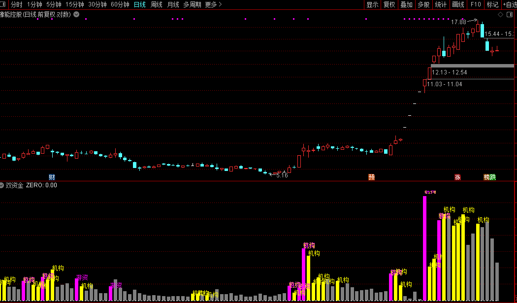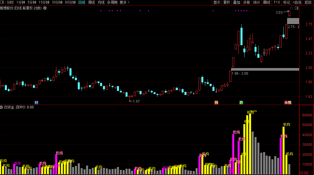 1. 机构强度(黄柱) :当出现黄色柱体并标注“机构”时,代表趋势型资金进场。
