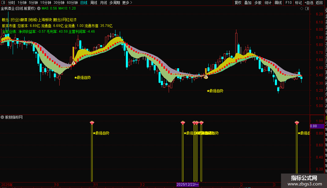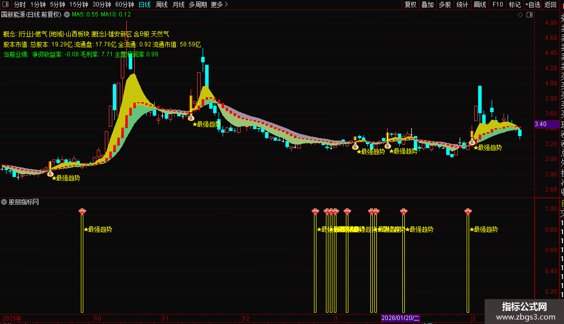 2. 副图指标:搭配主图使用,黄色柱体及“★最强趋势”提示出现时,确认趋势强度;