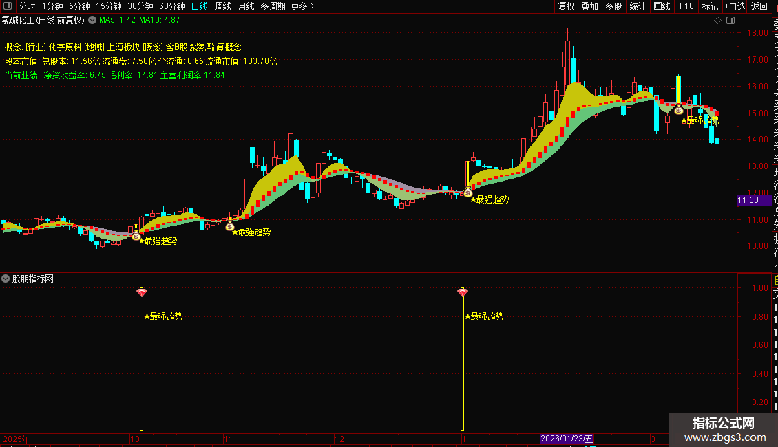 1. 主图指标:加载后查看K线旁基本面数据,关注“★最强趋势”文字+黄色K线+图标信号,信号出现代表短期趋势反转;