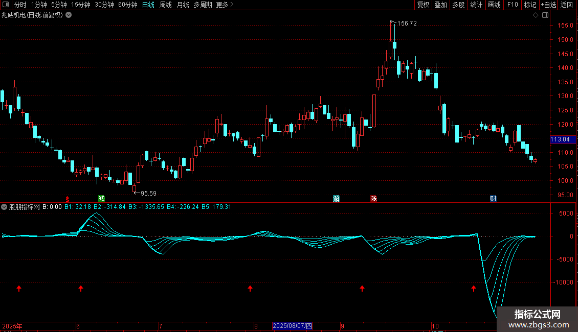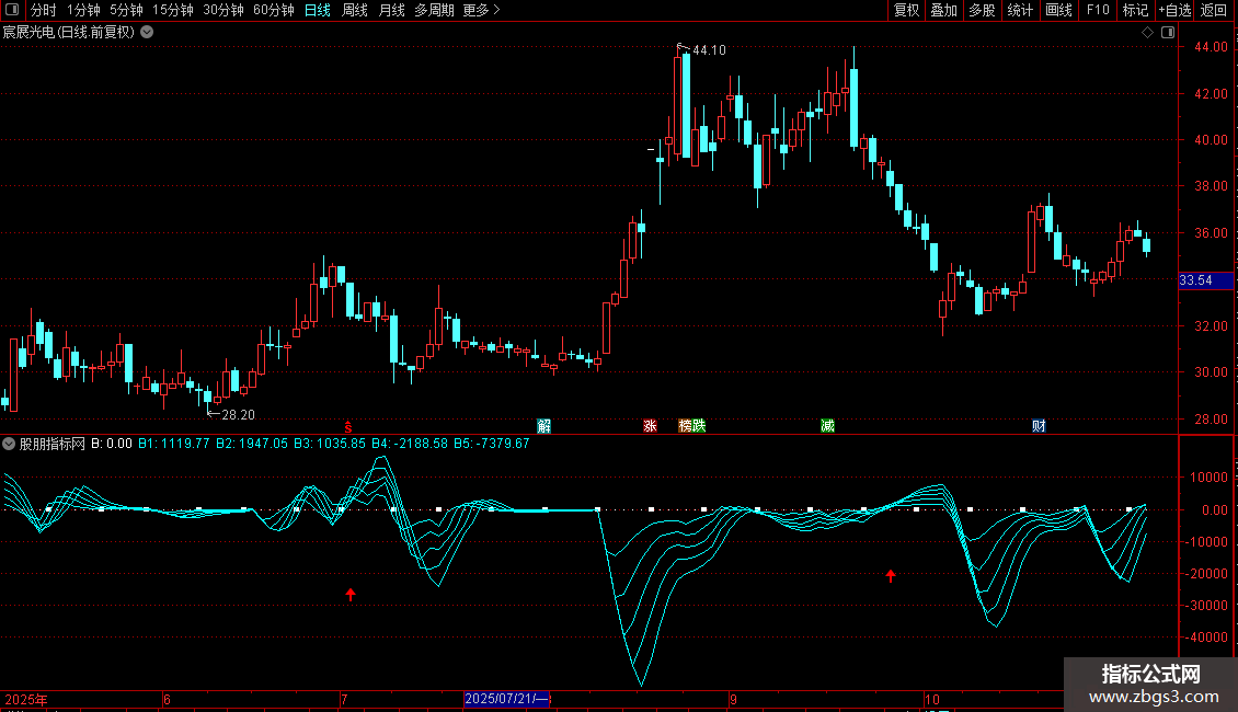 指标包含能量线B1至B5,以及基于能量线形态和强度的筛选条件。信号以图标形式在副图显示。