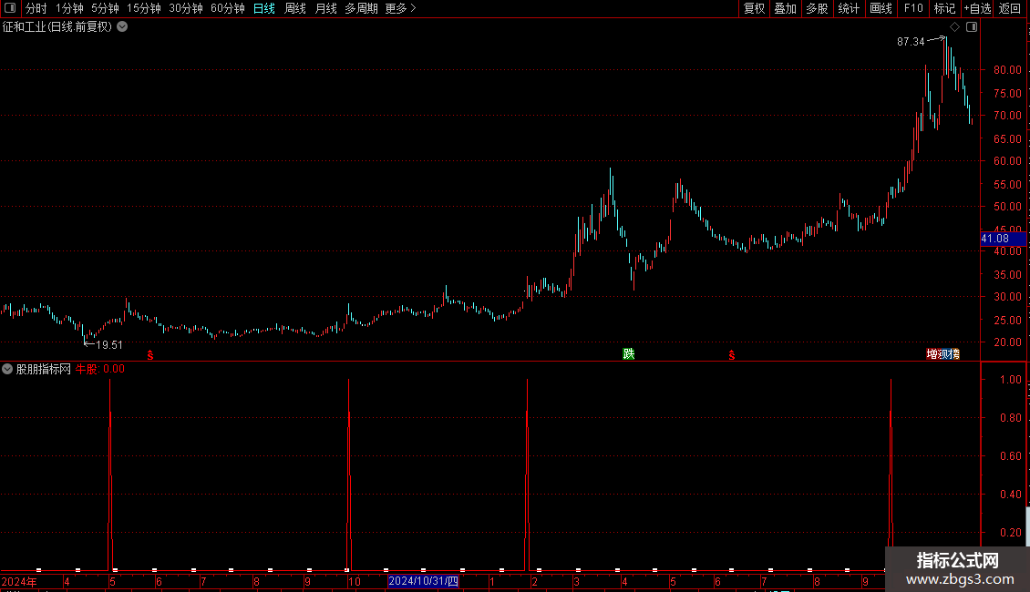 牛股:COUNT(AA,30)=30 AND V1>REF(V1,1)COLORRED;