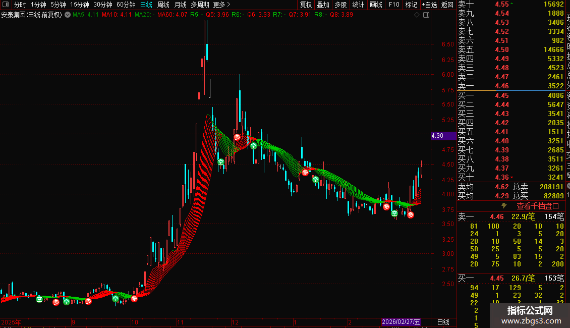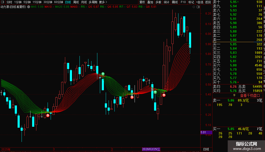 指标通过多重平滑均线判断趋势方向,红线代表上涨,绿线代表下跌。核心策略是捕捉短期均线上穿长期均线的“金叉”做多,下穿“死叉”做空。同时结合高低点突破逻辑,在图表上直接标注“多”、“空”文字信号,并用红绿柱状图强化显示当前持仓方向:红色柱体提示空头持有或卖出,绿色柱体提示多头持有或买入。适合趋势跟踪交易,帮助投资者过滤震荡噪音,明确进出场时机。