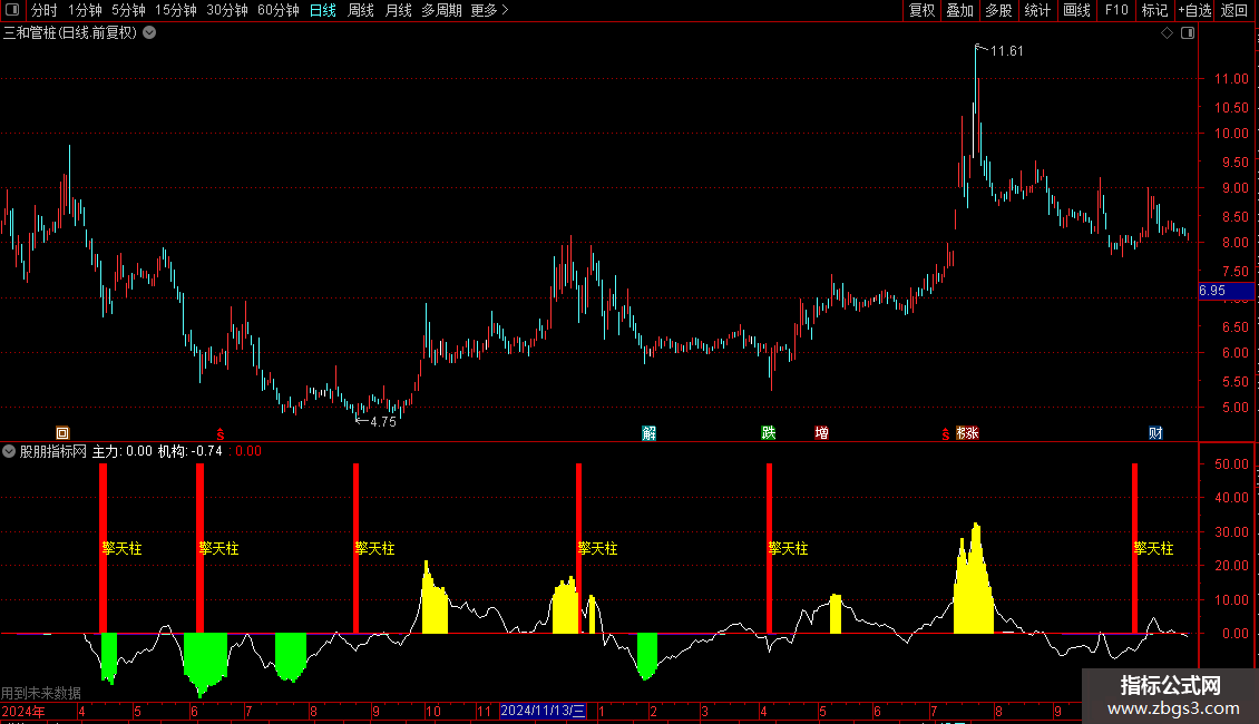 买入信号:指标在机构线处于低位(<-10)时,若同时出现红色“擎天柱”字样及柱状标识,提示可能形成重要的底部反转买点。此信号通常伴随成交量放大(VAR8)及均线系统即将转好等条件过滤。