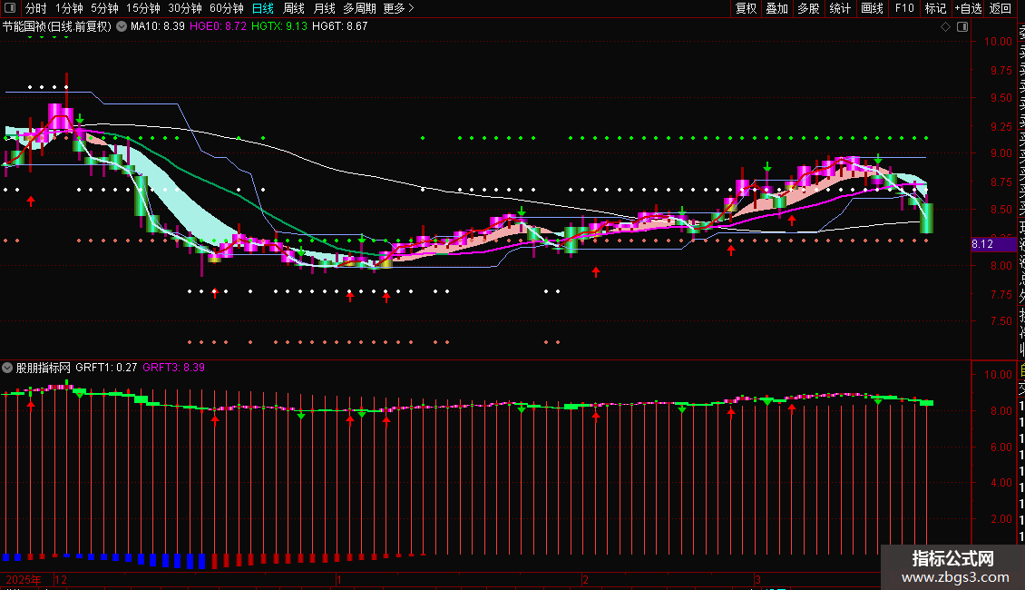 指标通过长短周期均线差值构建动能柱,直观展示股价趋势强弱与多空转换。红色粗线代表上涨趋势确认,绿色粗线提示动能减弱或转弱。核心策略是捕捉“大资金入场”信号:当动能柱在低位连续缩量下跌后突然拐头,且当日股价大涨、涨幅超5%并收在最高点附近时,触发紫色柱状图及文字提示,视为强力买入点。此外,动能柱由负转正或持续放大时也可作为辅助做多参考。