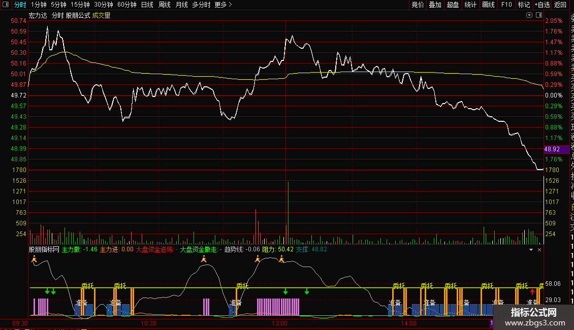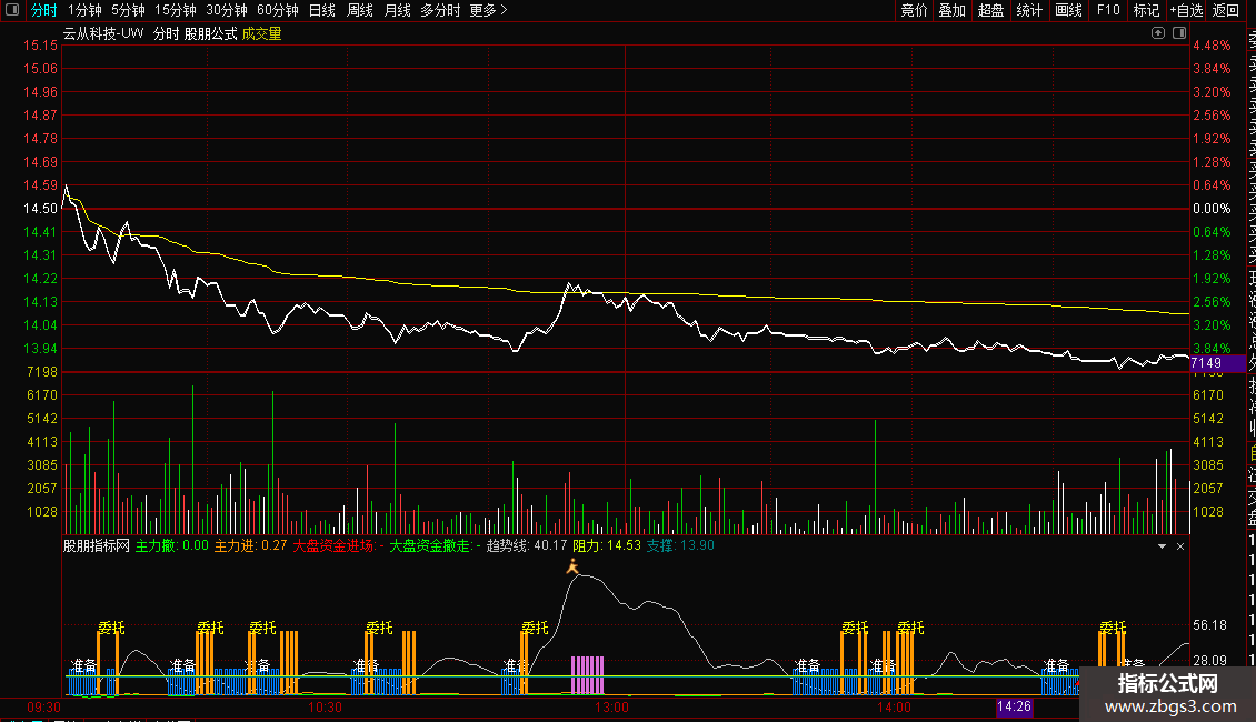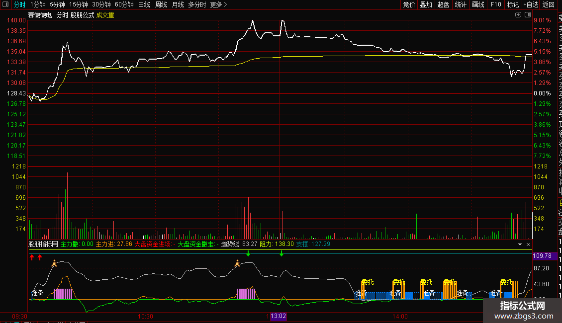 加载至副图。观察“主力进/撤”与“大盘资金”柱状图的颜色与高度,判断资金合力方向。结合“趋势线”的数值、拐点以及“准备”、“委托”、“见顶清仓”等文字和图标信号,辅助判断个股的阶段性买卖时机。同时可参考指标自动计算的支撑位与阻力位。