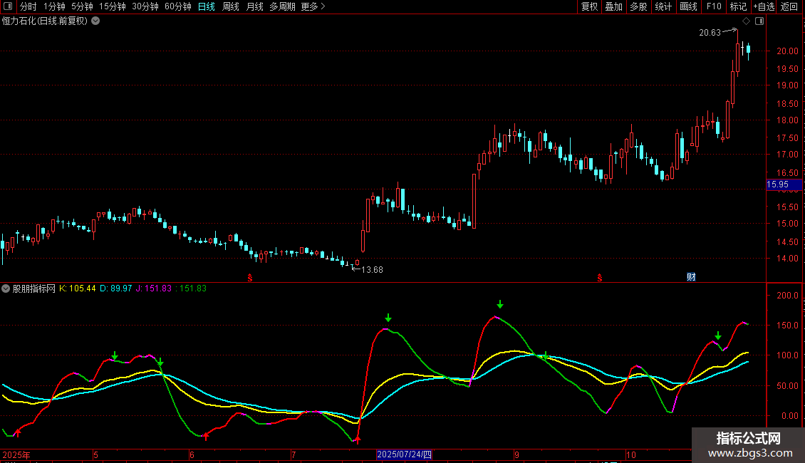 指标基于价格均值与标准差构建,通过计算K、D、J三条曲线分析价格偏离与动量变化。K线反映价格偏离均值的程度,D线为K线的平滑,J线为两者的差值。指标通过颜色区分J线涨跌,并在特定条件满足时显示买入或卖出图标。