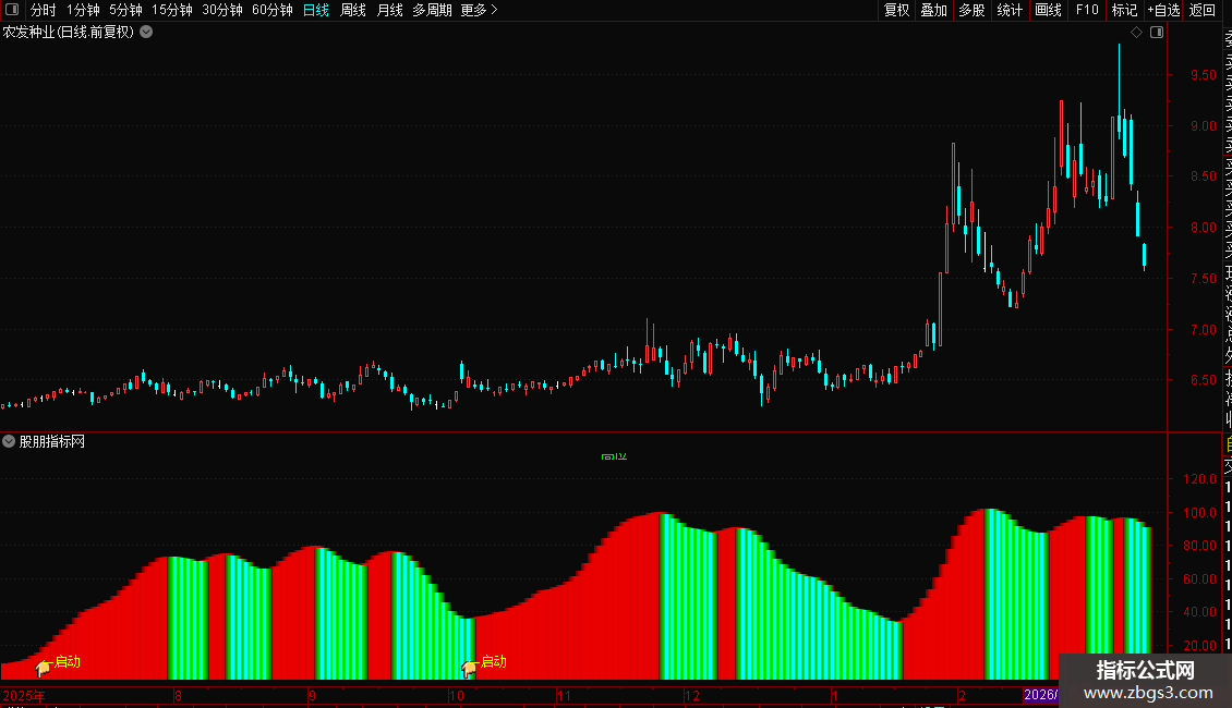 指标是一个综合性的趋势与买卖点提示系统。主要功能是通过多重均线、波动率及资金流向算法,判断股价所处的相对高低位及趋势强弱。操作策略上,当出现彩色柱状体由绿转红或数值上升时,代表多头动能增强,可视为持股或买入信号;当柱状体转绿或数值下降,提示风险增加应考虑减仓。此外,指标会在超跌区域提示“底”部机会,在均线金叉且处于低位时提示“启动”信号,辅助投资者捕捉趋势反转点。
