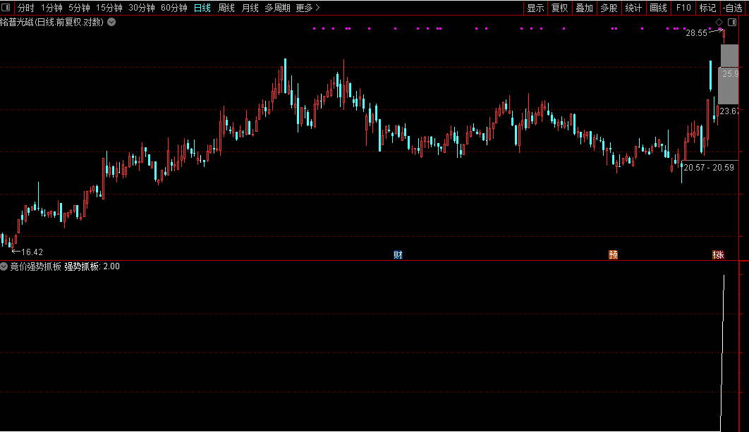 指标用于电脑端,交易日9:25后至9:30前,快捷键Ctrl+T选择竞价强势抓板X执行选股,结合当前行情择优布局;也可用副图竞价强势抓板排序筛选。