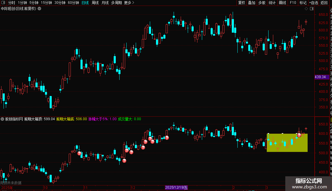 1. 绘制箱体:自动识别近期的高低点,形成一个箱体区间,并用色带标注。