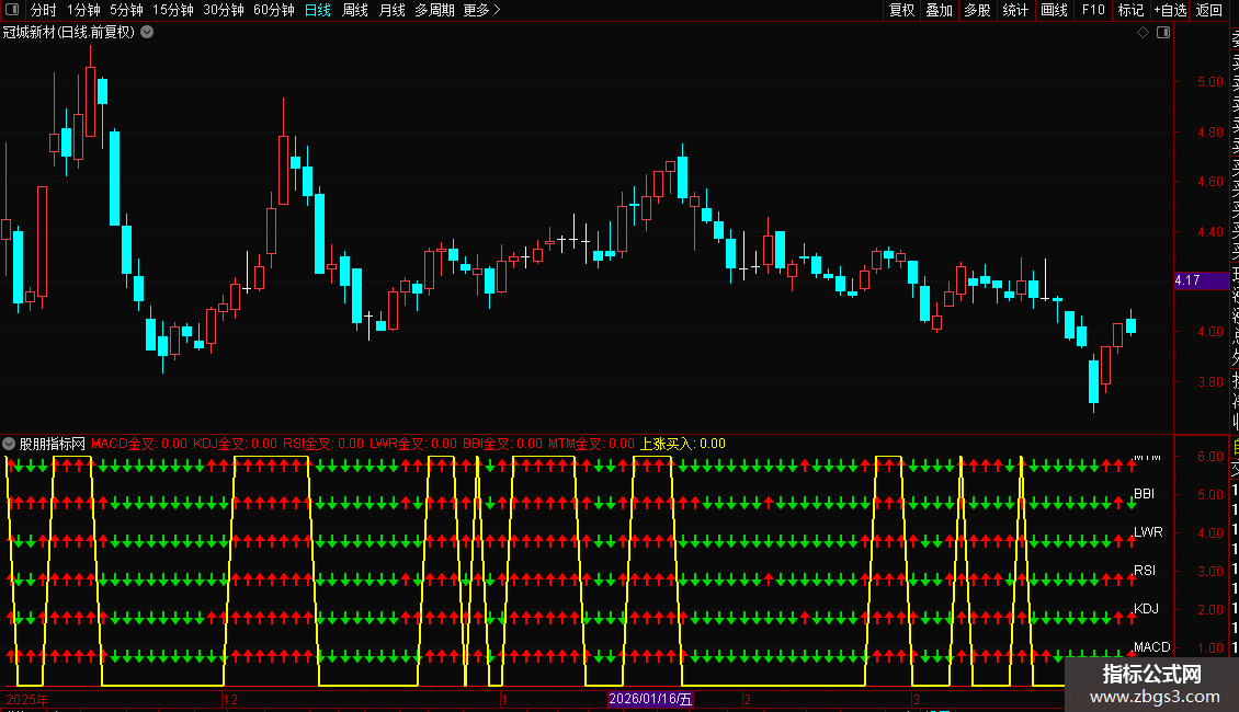 指标整合了MACD、KDJ、RSI、LWR、BBI和MTM六个常用技术指标,并对其金叉信号进行可视化。