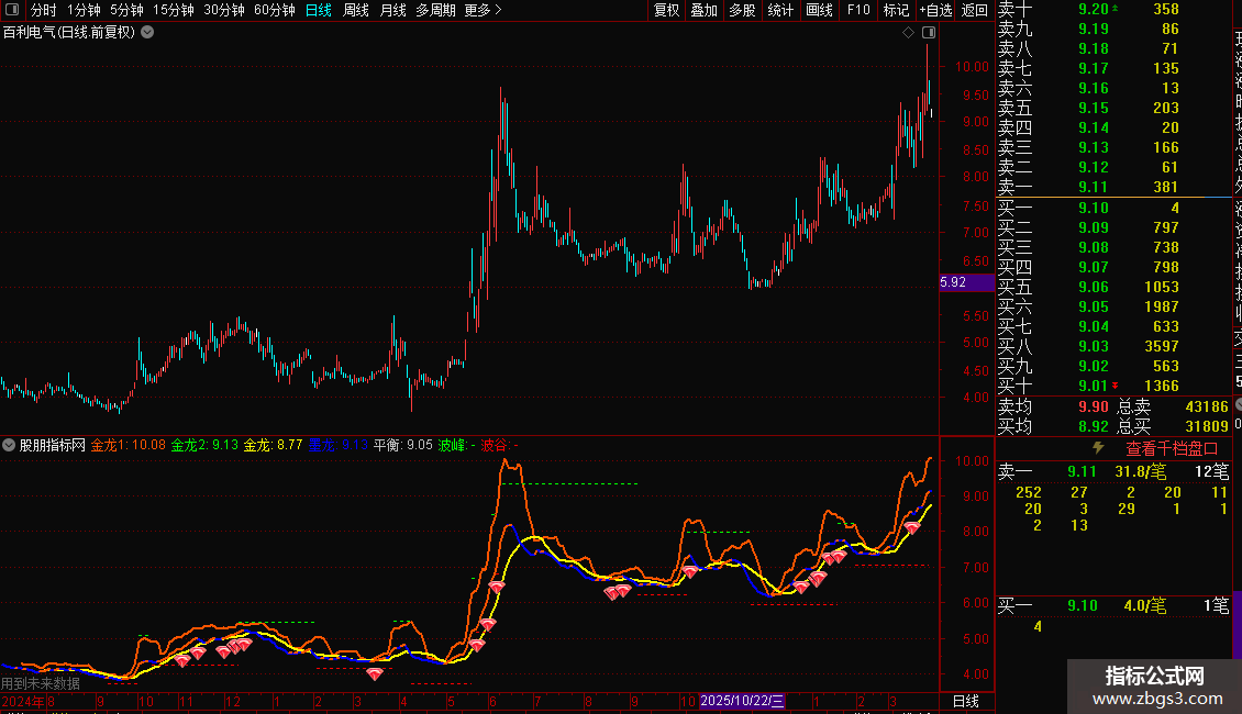 指标包含多条均线、通道线及支撑阻力线,并配有特定信号标记。
