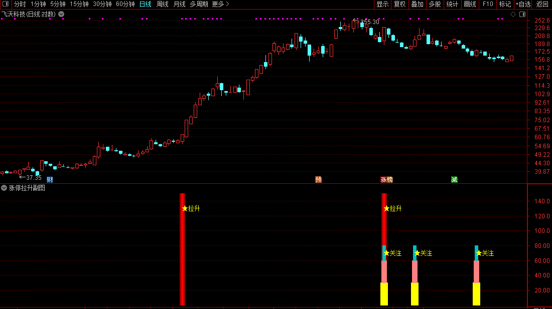 策略:当出现“关注”信号时,表示股票在上升趋势中出现了短线介入机会。当出现“拉升”信号时,表明上涨动能强劲,是持股或跟进的标志。