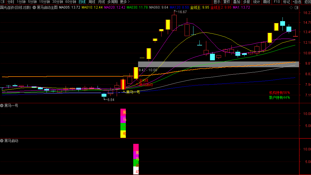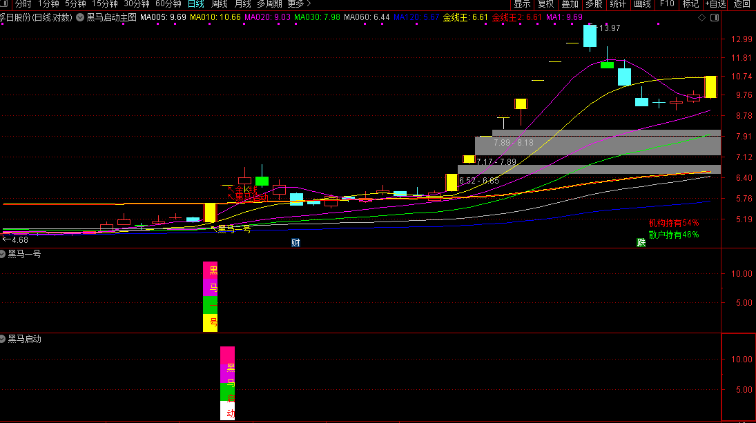 连续涨停前的黑马一号性质各异。龙头股“黑马一号信号”和“主图黑马一号”信号同时出现,是黑马个股启动密集涨停的核心信号。每只黑马股启动性质不同,软件会给出明确信号提示。结合【黑马启动】选股形成共振,上升力度更猛。