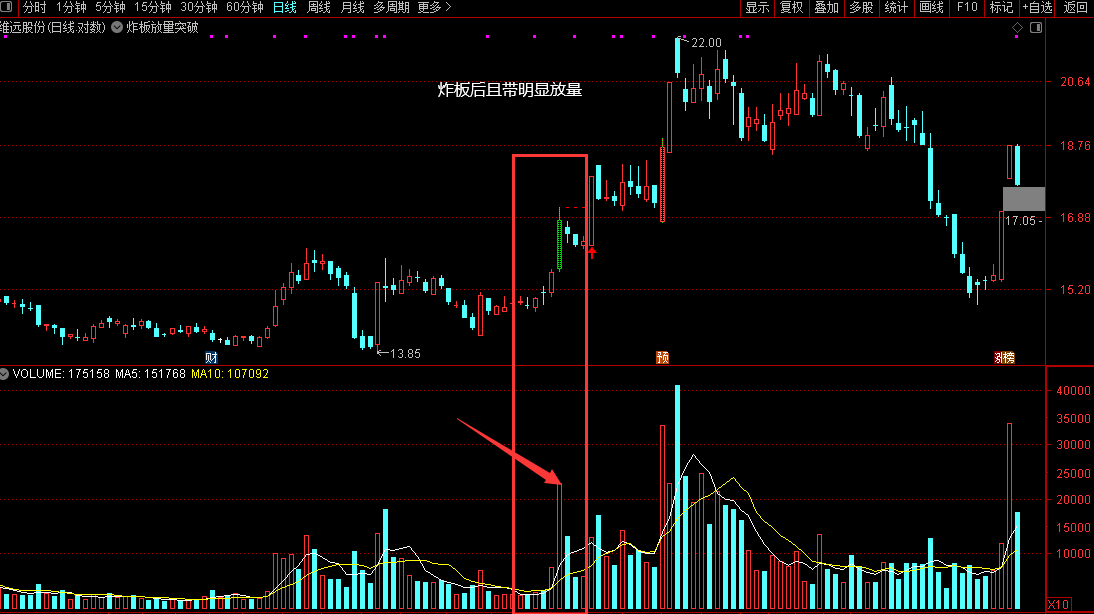 该指标公式深度融合了股票量价分析原理,通过炸板放量突破模式捕捉主力资金动向,是短线交易者不可或缺的实战工具。其核心逻辑基于成交量放大与价格突破的双重验证,有效过滤了市场噪音,提高了信号准确性,在股票指标公式中具有较高的实战应用价值。