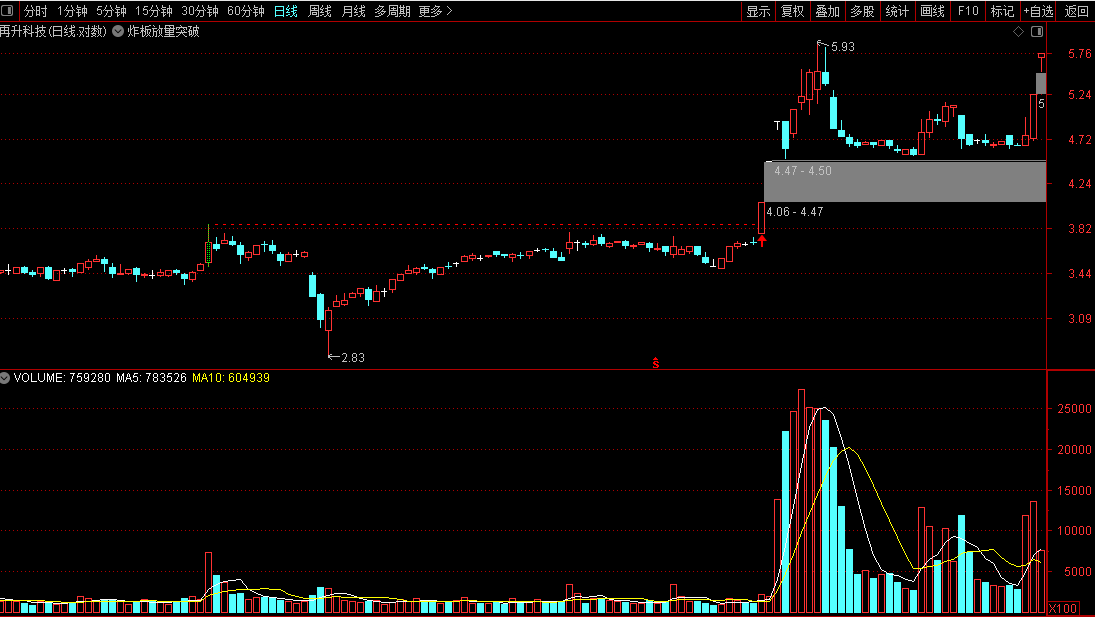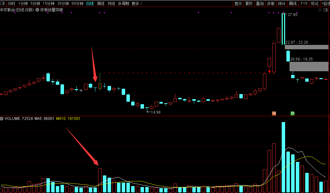 在股票技术分析中,"炸板放量突破"模式是主力资金运作的典型信号。该模式的核心逻辑在于:当个股涨停后出现炸板(即打开涨停板)并伴随成交量显著放大时,往往意味着主力资金正在积极操作。这种量价配合形态是捕捉主力动向的关键信号位,具有较高的实战价值。从案例分析来看,此类炸板倍量形态出现后,通常会经历一段震荡洗盘期。此时需重点关注股价能否有效突破炸板当日的最高点——这一位置是主力资金成本区的重要参考。一旦股价成功突破该高点,意味着当日追高被套的资金已全部解套。根据主力行为逻辑,其不会单纯为散户解套,突破后往往预示着更大的上涨空间即将展开。本指标套装中的主图指标已对这一模式进行可视化处理:黄色虚线清晰标注炸板当日的最高点水平线,红色箭头则精准标识突破信号,这也是选股入场的关键位置。实战操作中,以炸板当日的收盘价作为防守位,只要股价不跌破该价位,即可继续持有,等待主升浪展开。