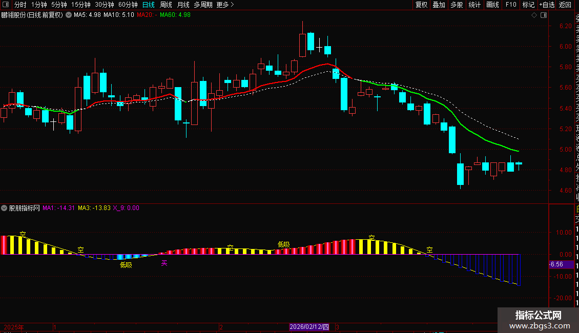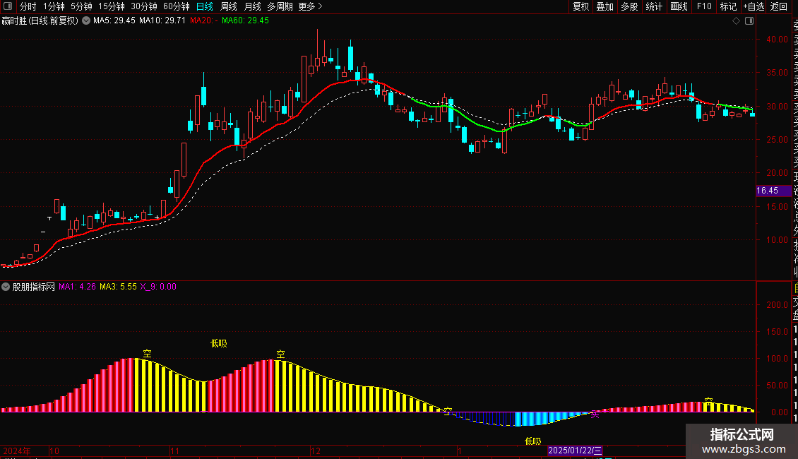 副图通过“主力动向”与MA1/MA3交叉信号,识别主力动向及“低吸”“买”时机,搭配RSI超买预警。