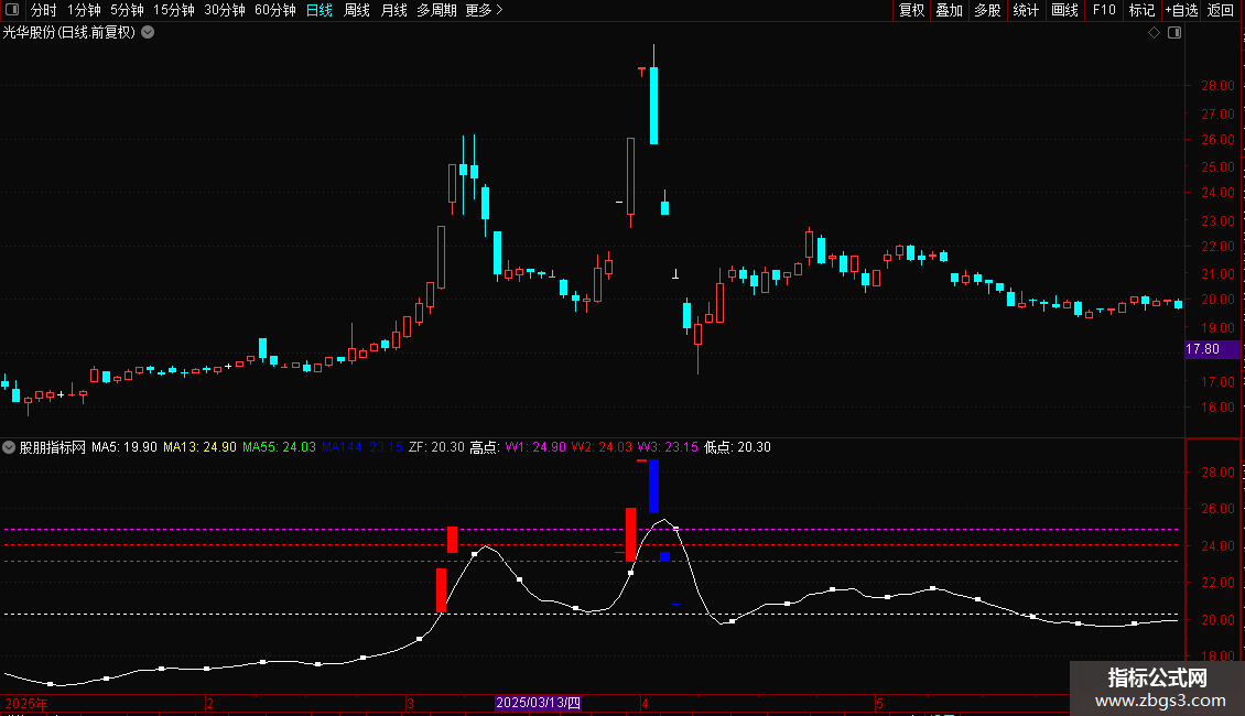 1. 均线系统:绘制5日(白)、13日(黄)、55日(绿)、144日(蓝)四条均线。