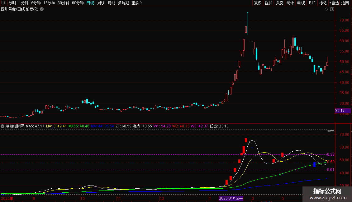 指标结合了均线系统、价格通道与黄金分割位分析,并标记涨跌停K线。