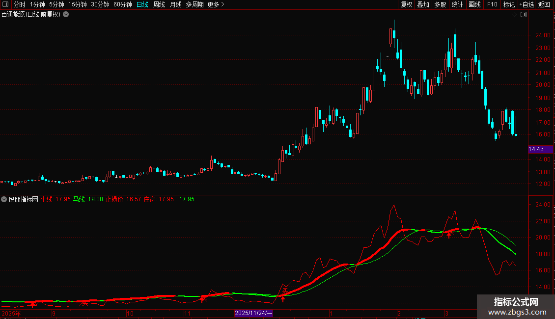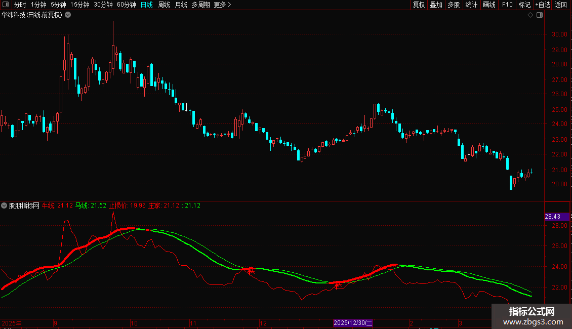 5. 庄家线:其计算与牛线完全相同,但通过颜色和粗细变化直观显示其涨跌:上涨时用红色粗线标示,下跌时用绿色细线标示。