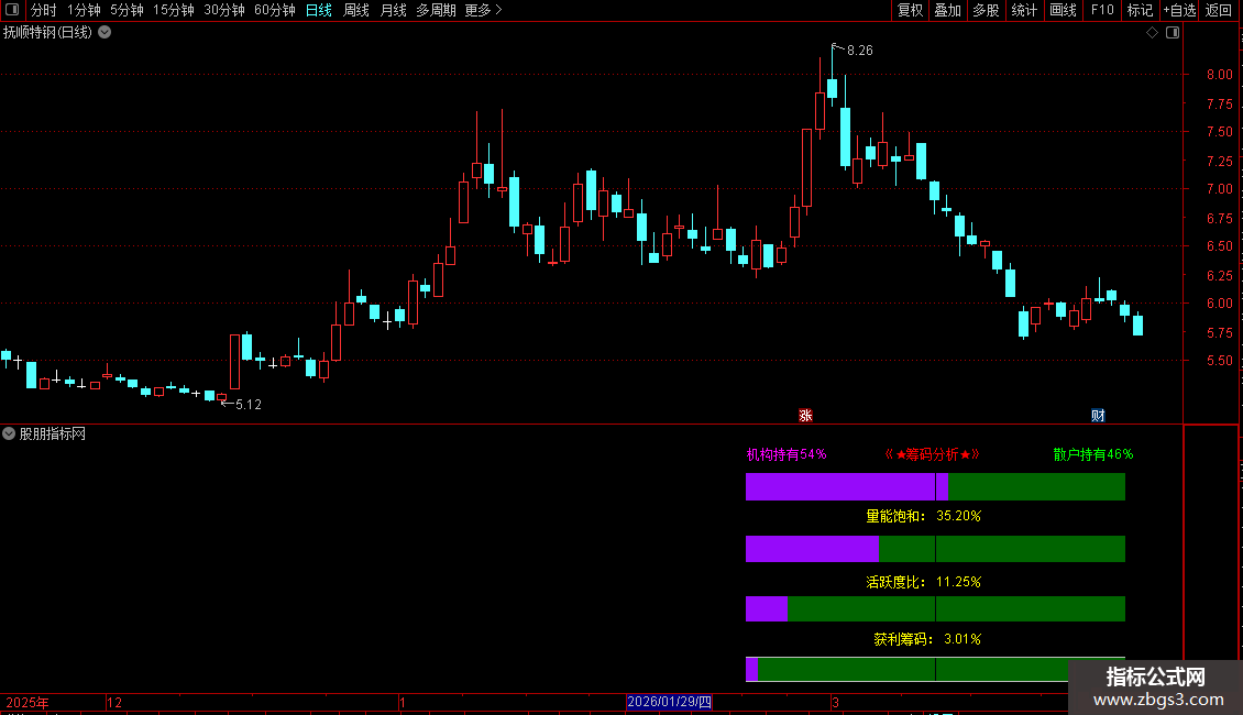 看主力占比:屏幕右上角显示“机构持有”与“散户持有”百分比。当机构持有比例持续上升且超过散户时,往往是主升浪启动的信号。