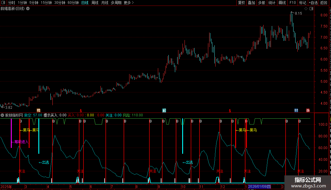 1. 副图公式:加载至通达信K线副图,白色“买入”柱+“B”为基础买点,黄色“黑马”提示强势启动,绿色“洗盘”建议观望,紫色“筹码进入”可低吸,青色“出逃”需止盈;