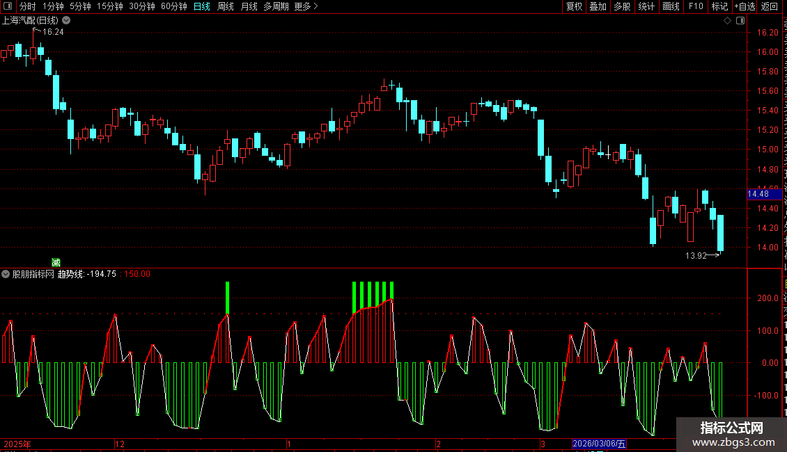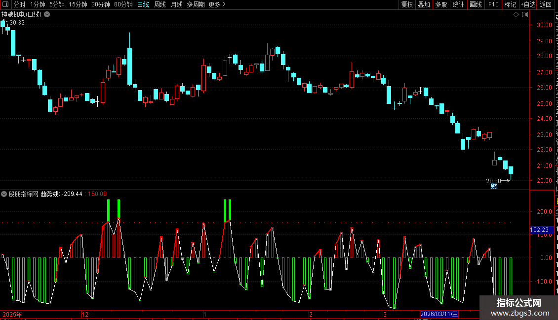 当“趋势线”数值超过150时,会触发一个绿色警示信号,提示可能进入超买或高风险区域。