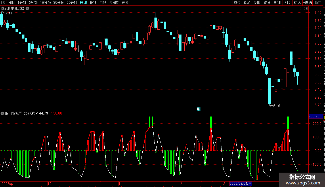 风险警示信号:当“趋势线”数值大幅攀升并超过150参考线,特别是触发顶部绿色警示区域时,需警惕股价可能过热,存在回调风险。