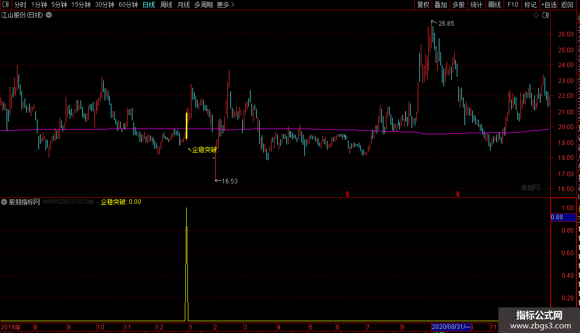 自定义技术指标,主要用于在K线图上显示股票的综合信息和交易信号。