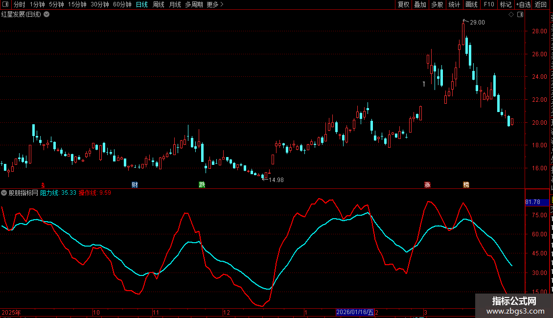 使用方法:通常观察两条线的交叉与方向。当短期操作线上穿长期阻力线时,可能预示向上突破的买入机会;反之,下穿则可能预示走弱。同时,可结合指标线自身的超买超卖区域(如接近100或0)进行判断。