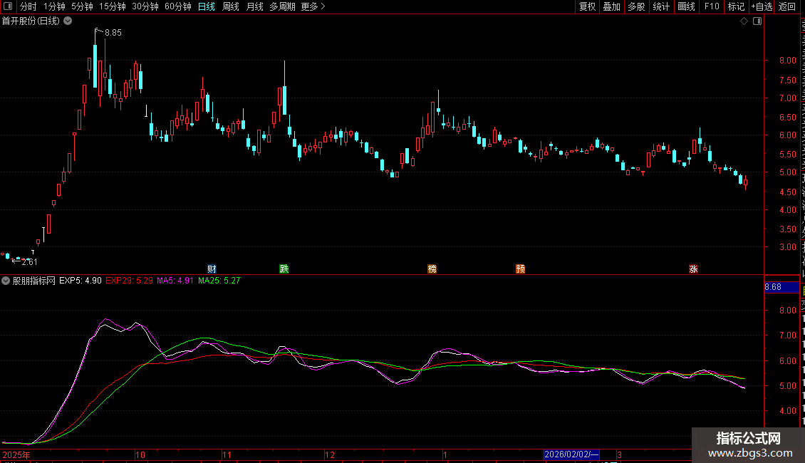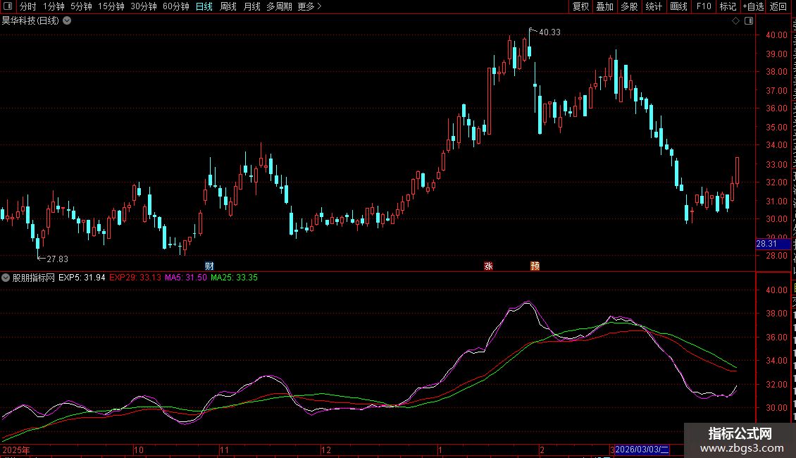 4. 均线系统:叠加了5日、25日简单移动平均线(MA)以及5日、29日指数移动平均线(EXPMA),用于判断趋势和支撑压力。