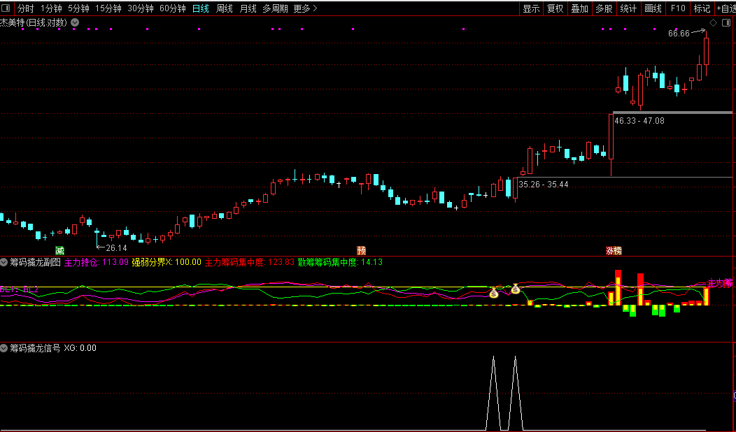 2. 主力筹码上穿散筹筹码(主力主导行情,散户跟风意愿减弱,筹码集中度提升,上涨动能充足)。