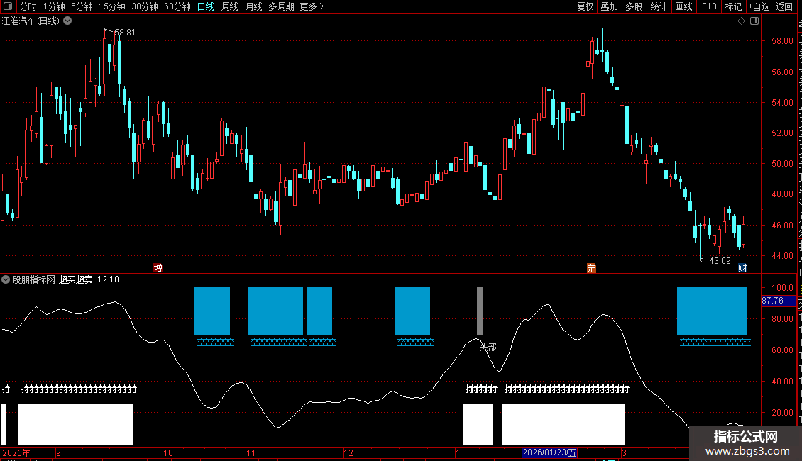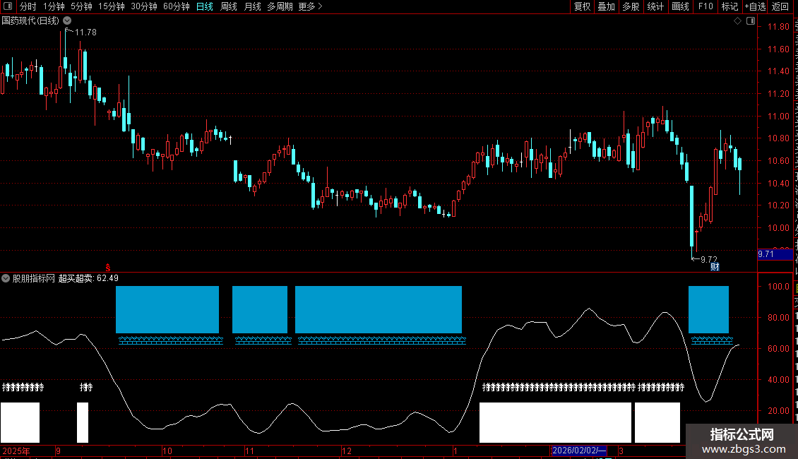 `超买超卖`线高于某一数值(如80)时警惕超买,低于某一数值(如20)时关注超卖。