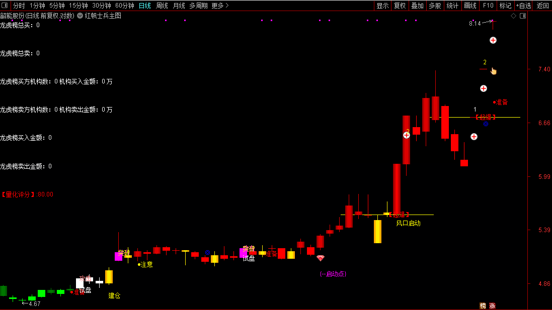 6. 风口启动(蓝色K线 + “风口启动”文字)条件:KDJ金叉 + 小市值(0-80亿) + 股价2-22元 + 非ST/创业板/科创板 + 近两日首次涨停用法:专门捕捉小盘首板股,适合打板策略