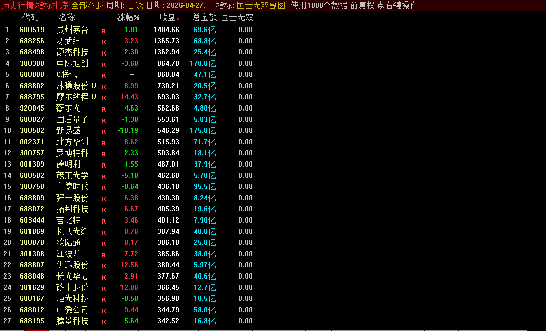 交易日9:25后-9:30之前,快捷键 .401排序。有盘口实时数据 不支持回测 国士无双是一款专为通达信软件设计的集合竞价选股指标。该指标基于开盘金额、开盘换手率、竞价量比、开盘涨幅等核心数据,通过综合运算生成竞价强度、强弱排序等关键值,帮助筛选出早盘竞价阶段表现强势、资金承接有力的短线个股。