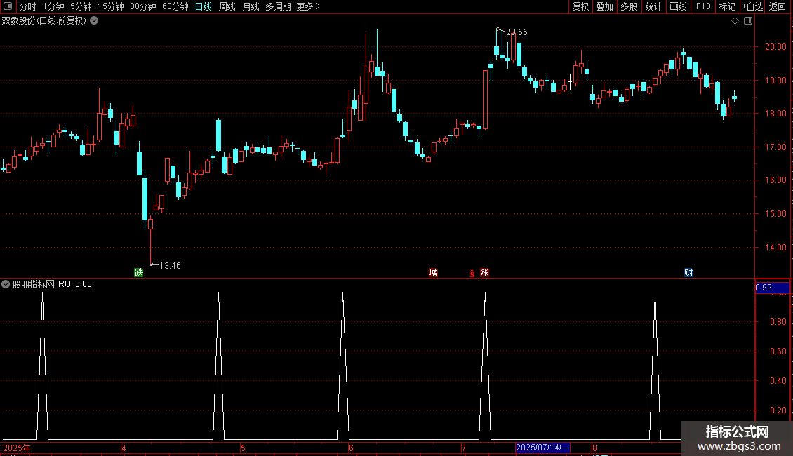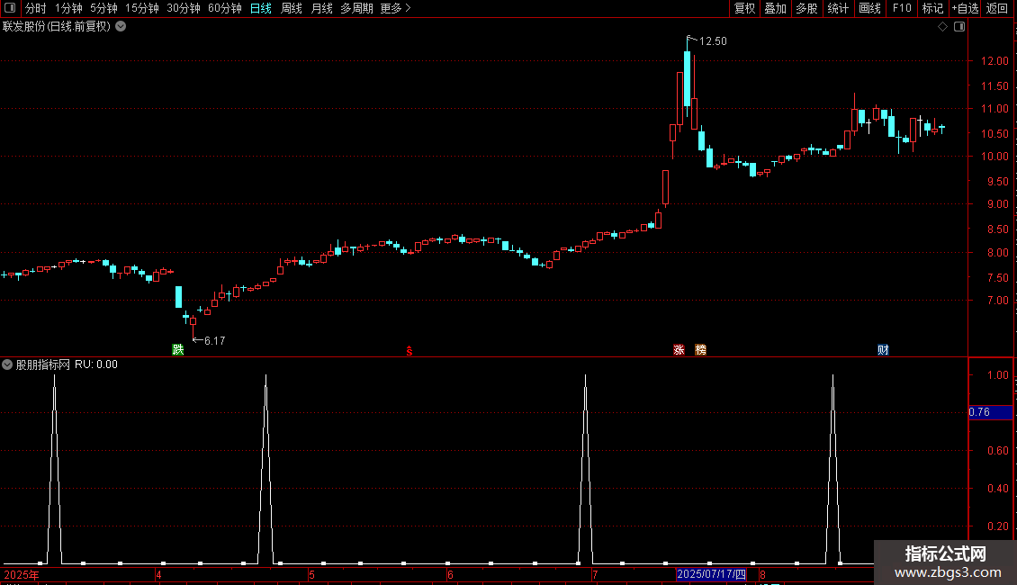 该公式计算一个加权移动平均线MM(基于价格加权值NN),再取MM的5日均线CC。RU信号为MM上穿CC时触发买入提示。