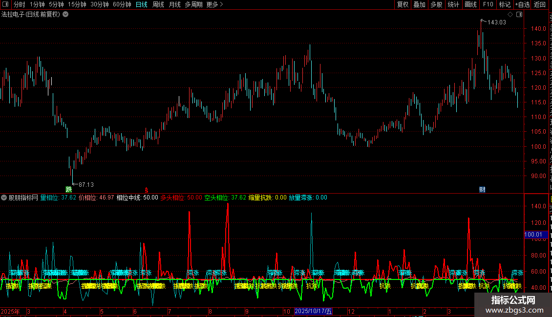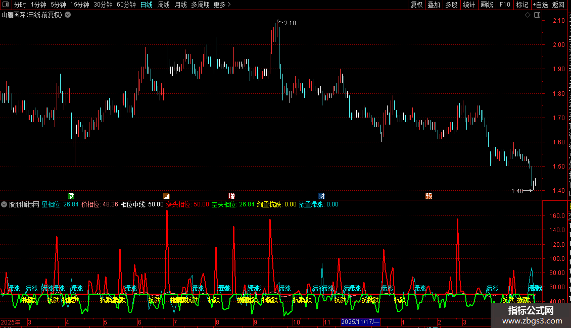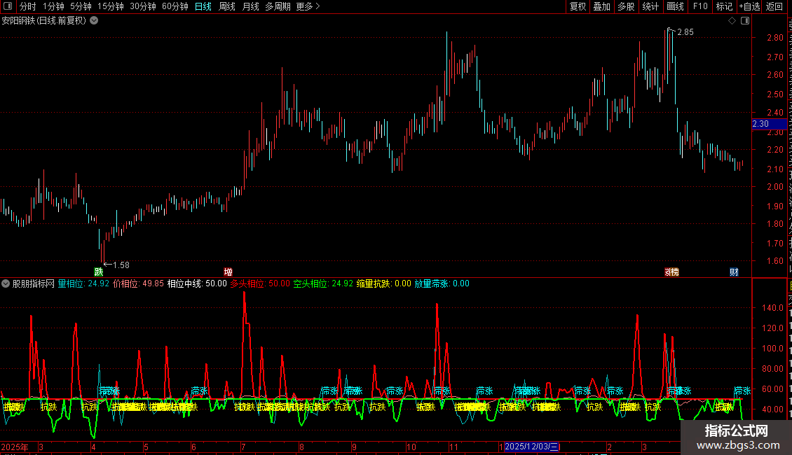 功能核心:指标包含“价相位”和“量相位”两条线,以及一条中线。当两条线同在中线上方,代表量价齐升,是健康的多头趋势;同在中线下方,则为量价齐跌的空头趋势。