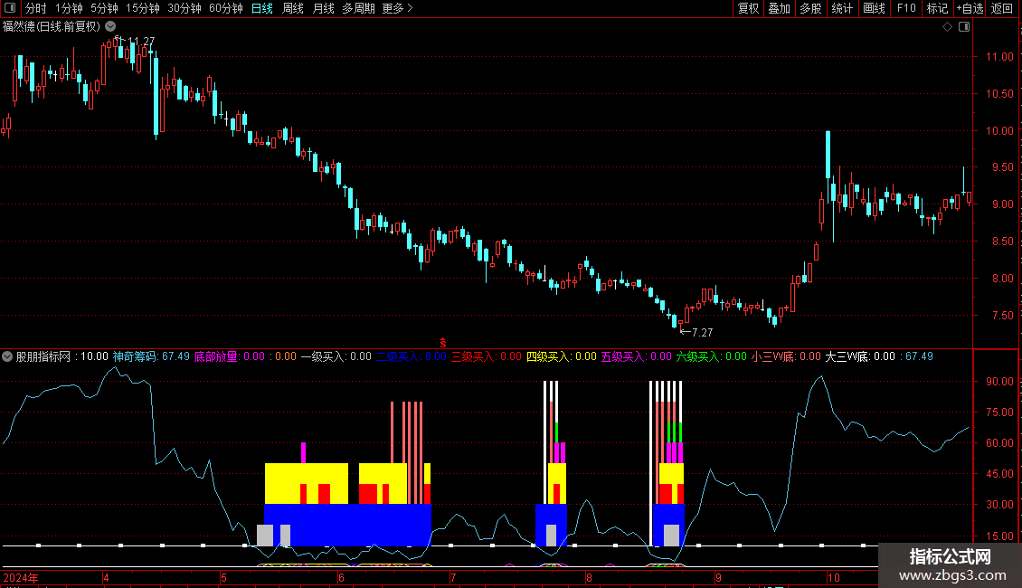 小三W底:COUNT(CROSS(神奇筹码,10),42)=2 AND 神奇筹码<6,COLOR6666FF;