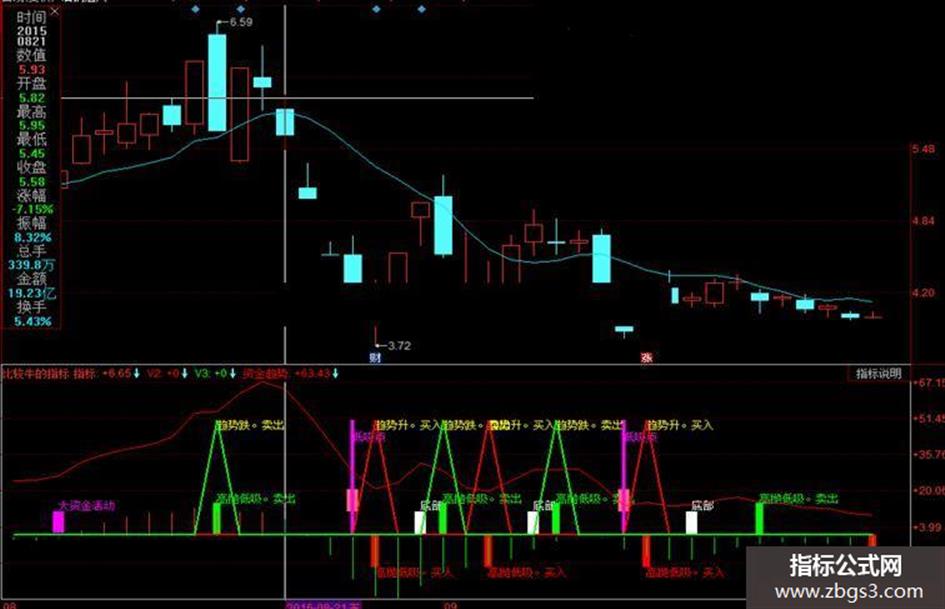 DRAWTEXT(VAR1,50,'趋势跌。卖出'),coloryellow;