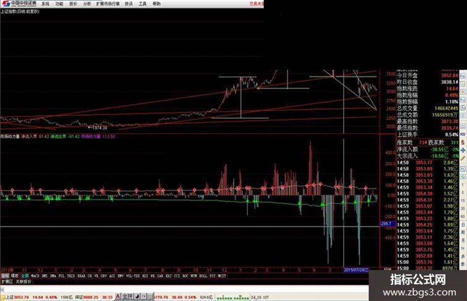 净流入界:C/50,COLORLIRED; 净流出界:-C/50,COLORGREEN; AA:=C-MA(C,9),NODRAW; 市场动力量:(AA)*(V/MA(V,9)),VOLSTICK; DRAWICON(CROSS(市场动力量,净流入界),净流入界,1); DRAWICON(CROSS(净流出界,市场动力量),净流出界,2);