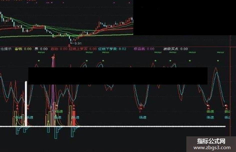VAR2:=REF(LOW,1); VAR3:=SMA(ABS(LOW-VAR2),13,1)/SMA(MAX(LOW-VAR2,0),13,1)*100; VAR4:=EMA(IF(CLOSE*1.2,VAR3*13,VAR3/13),13); VAR5:=LLV(LOW,34); VAR6:=HHV(VAR4,34); VAR7:=IF(LLV(LOW,55),1,0); VAR8:=EMA(IF(LOW<=VAR5,(VAR4+VAR6*2)/2,0),3)/618*VAR7; VAR9:=EMA(CLOSE,5); VAR10:=(CLOSE-MA(CLOSE,34))/MA(CLOSE,34)*(-10); VAR11:=EMA(IF(LOW<=VAR5,(VAR4+VAR6*2)/2,0),3)/618*VAR7*(-1); VAR12:=EMA(CLOSE,5)*(-1); STICKLINE(VAR8>REF(VAR8,1),0,VAR8,6,1),COLOR10FFFF,LINETHICK3; 备钱:IF(VAR8>REF(VAR8,1),0,VAR8),COLOR0FFFFF; STICKLINE(VAR11>REF(VAR11,1),0,VAR11,6,1),COLORFFF810; 界:0,COLORFFFFFF,LINETHICK1; XL1:=MA(LOW,2)*0.96; XL2:=MA(LOW,26)*0.85; XL3:=REF(XL1,1)<XL2 AND REF(XL1,1)<XL1 AND REF(XL1,1)<REF(XL1,2); STICKLINE(XL3,0,VAR8*3,8,0),COLORRED; 启动:IF(XL3,0,VAR8*3),COLORRED; VA:=(2*C+H+L)/4; VB:=LLV(L,5); VC:=HHV(H,5); 红线上穿买:EMA((VA-VB)/(VC-VB)*27,5),COLORRED; 红线下穿卖:EMA(红线上穿买,3),COLORFFFF00; 散户:= EMA(((2*CLOSE+HIGH+LOW)/4-LLV(LOW,5))/(HHV(HIGH,4)-LLV(LOW,5))*100,4); 庄家:= EMA(0.667*REF(散户,1)+0.333*散户,2); DRAWTEXT(CROSS(散户,庄家) AND 散户<30,5,'低进'),COLOR00FF00; DRAWTEXT(CROSS(散户,庄家) AND 散户<30,7,'●'),COLORFFFFFF; DRAWTEXT(CROSS(庄家,散户) AND 散户>70,25,'高出'),COLOR00FF00; DRAWTEXT(CROSS(庄家,散户) AND 散户>70,22,'●'),COLOR00FF00; 极品底:IF((MA(C,5)-C)/C>0.04 AND (MA(C,10)-MA(C,5))/MA(C,5)>0.04,23,0),LINETHICK2,COLORFF00FF;