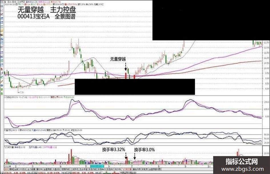 我们把换手率在6%以下全盘穿越的称之为无量全盘穿越,在6%以上的全盘穿越的涨停称之为放量全盘穿越。无量全盘穿越表现的主力控盘的程度,换手率越小,控盘力度越好,因为换手率越小就能轻松穿越筹码密集区说明了,主力持有了大量的筹码;而放量全盘穿越则表明了主力没有控盘或控盘力度较差,主力花费大量资金去建仓,导致了成交量放大,换手率大幅放大,而这种涨停代表了主力拉高建仓,重新布局的迹象,也表明了主力的攻击决心,以大的资金量突破筹码密集区,攻击只是刚刚开始。