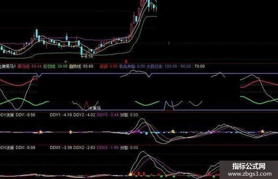 大势已去:IF(CROSS(黑马线,A1) AND 黑马线>70 AND 趋势线>80,90,100),LINETHICK2,COLORE66878;
